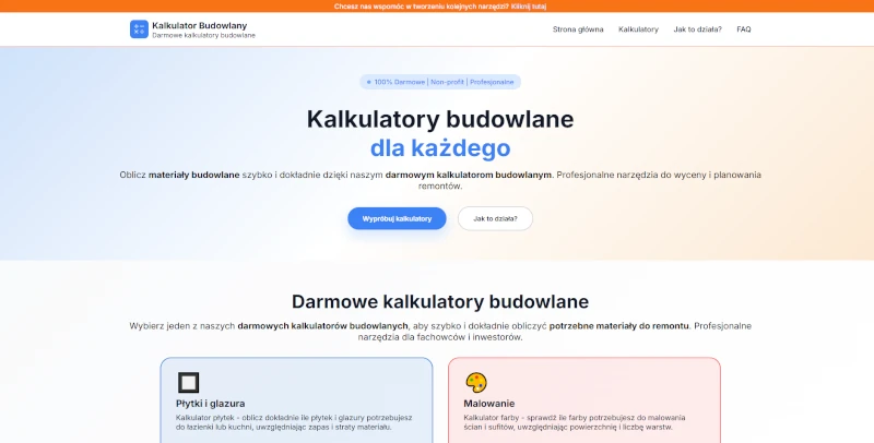 Stworzyliśmy nowoczesną aplikację webową dla branży budowlanej, zaprojektowaną i wdrożoną od podstaw w Next.js. Projekt jest w pełni responsywny, zoptymalizowany pod SEO oraz oparty o przejrzyste i intuicyjne UI/UX. Aplikacja została zaprojektowana z myślą o wysokiej wydajności oraz łatwej rozbudowie o kolejne funkcje i kalkulatory. Umożliwia szybkie kalkulacje kosztów oraz eksport wycen do pliku PDF.